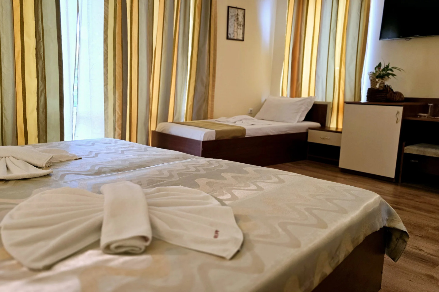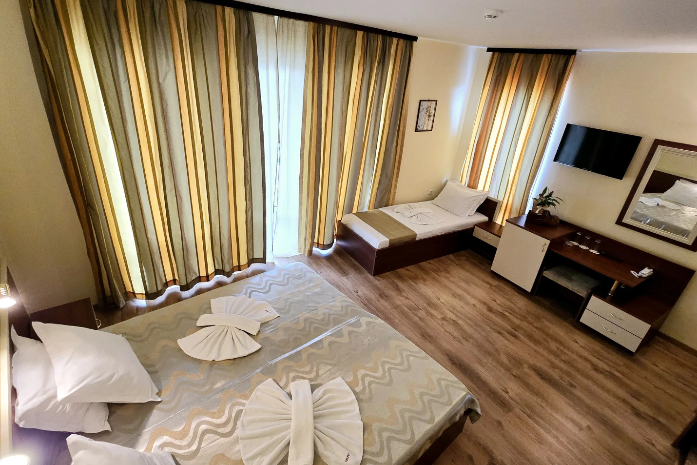 Comfortable TRIPLE room, furnished with one large king-size bed and one single bed, or three standard single beds. Each room has central air-conditioning system, direct telephone, TV, mini-bar, private bathroom, hair-dryer, shades and balcony.